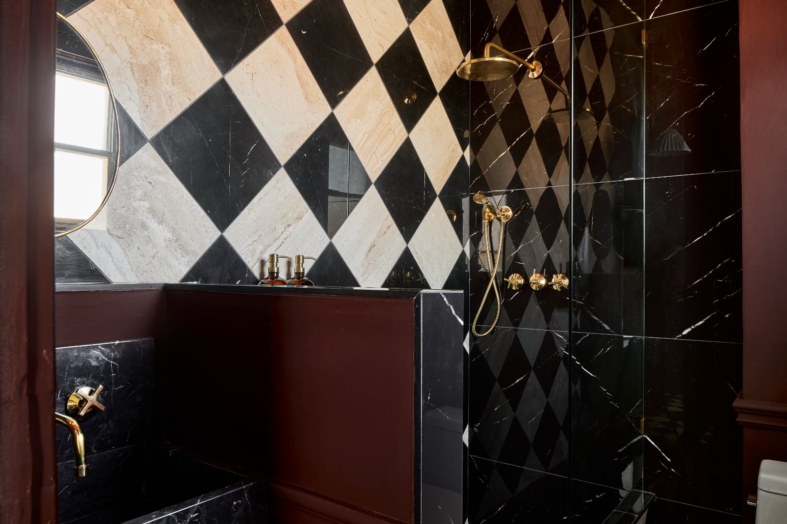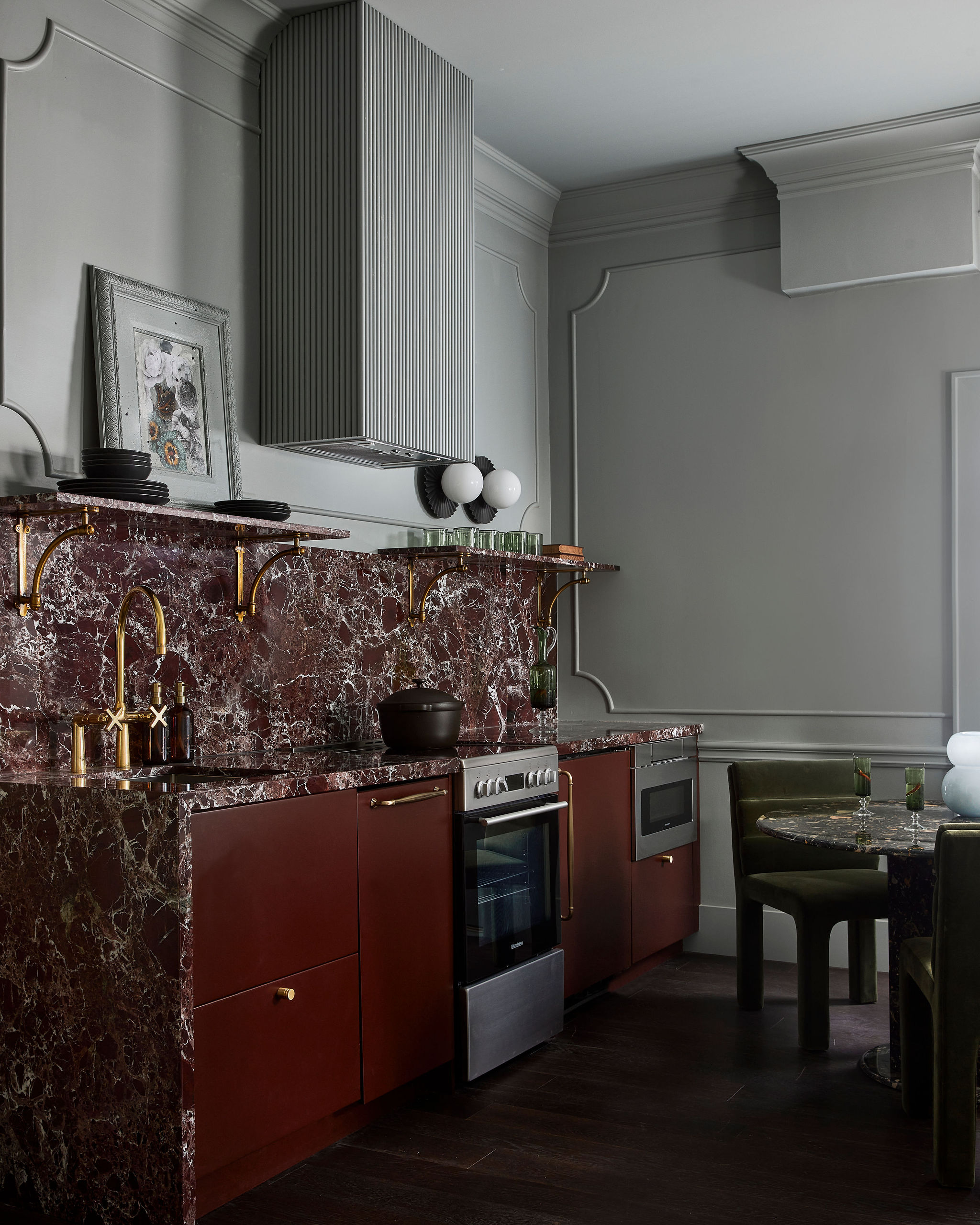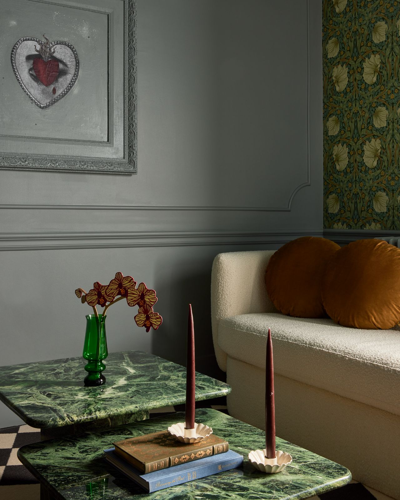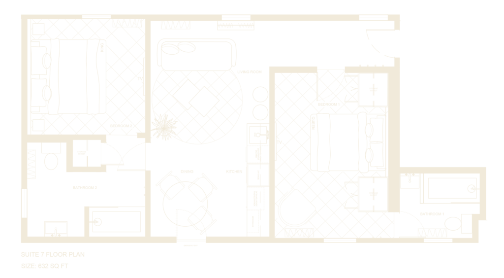 Entering a lush floral wrapped hallway into a spacious two bedroom suite, flat 7 feels inviting and sophisticated. With a unique colour palette this suite leans into dusty blues, deep maroon tones paired with edgy blue and yellow floral patterns
