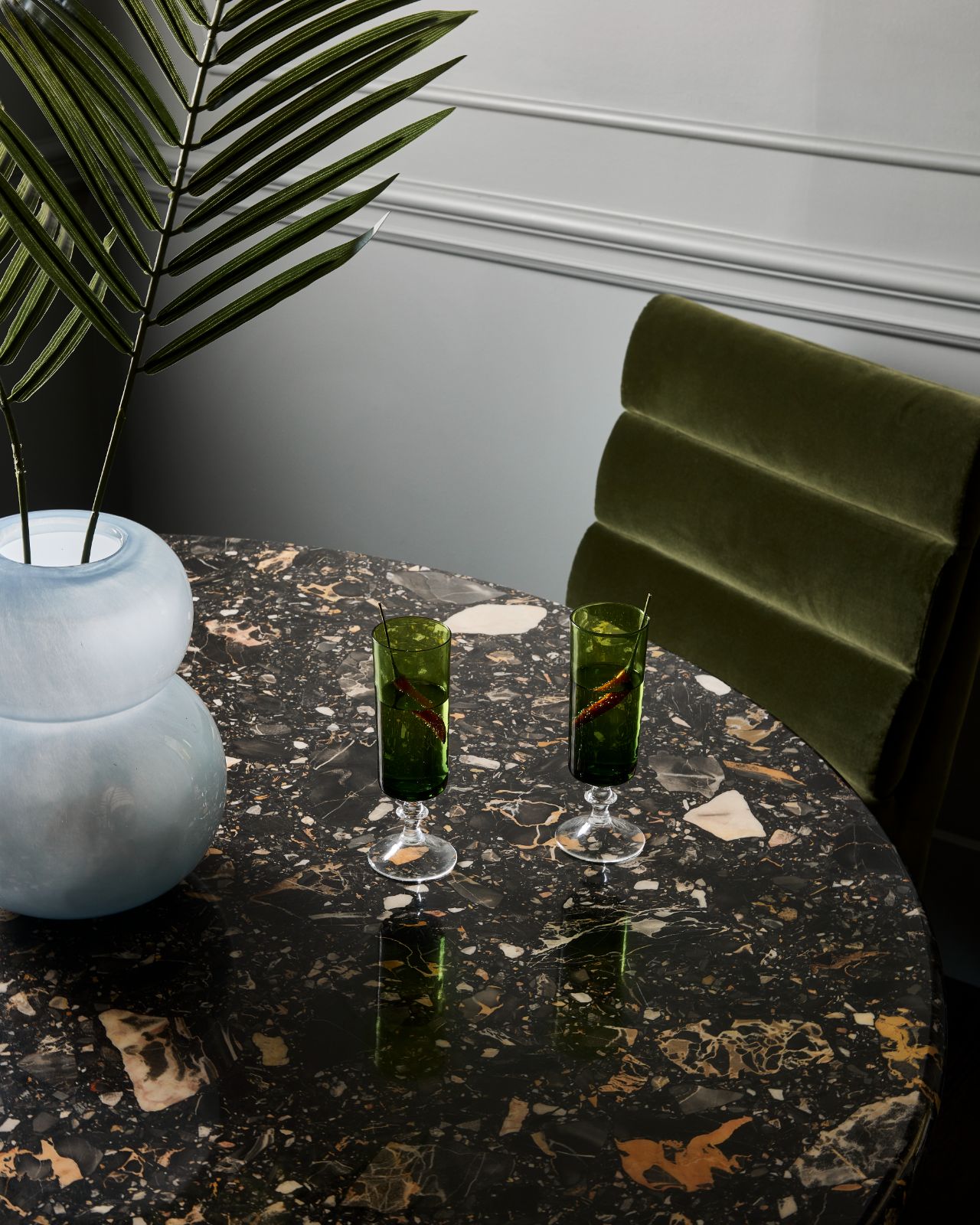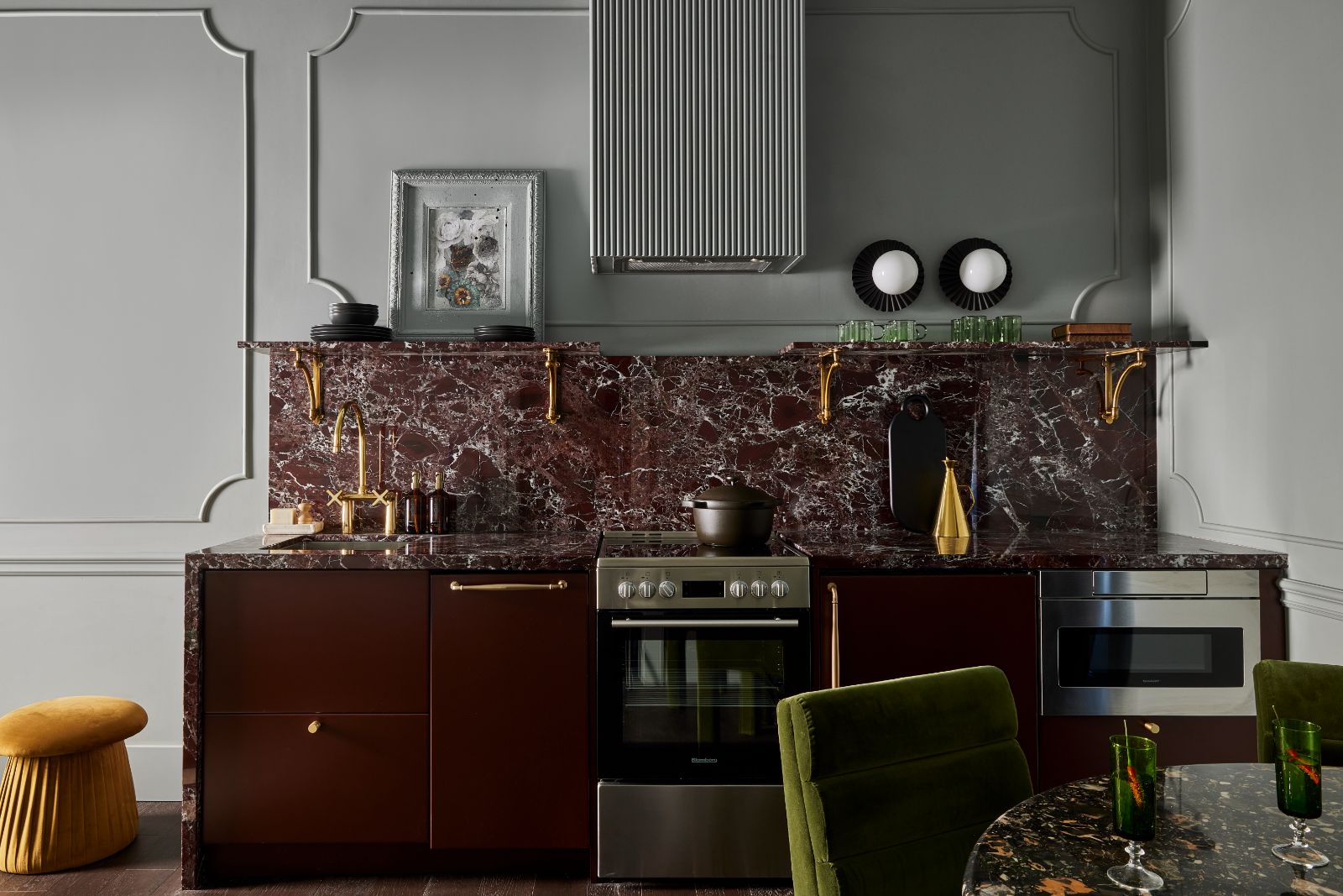 Entering the common area a large comfy boucle sofa grounds the living space accented with golden velvet pillows and ottomans. A vintage black terazzo fleck dining table seats three for dinner with stools available to pull up for more guests.